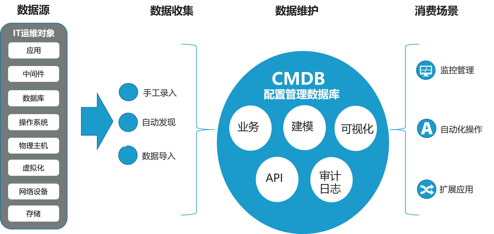 在挖掘數據信息價值的進程中,長城汽車走在了行業的前沿,數字化團隊利用PaaS平臺的接口、管控能力,充分納管調用企業的IT對象,構建統一且彼此集成的監控告警中心和CMDB。一體化平臺的建設破除數據源不統一、覆蓋IT對象不完全的問題,并以自動化集成保障信息的及時與質量,同時節省大量的人工成本。信息成為深化轉型重要的元素,為信息保障場景提供支撐,如:數字化團隊利用CMDB為監控系統提供配置信息收斂告警,提升故障發現和處理的效率。此外,CMDB與各場景工具的集成讓消費配置信息不再曠日累時,CMDB能及時保障數據的準確性和及時性。