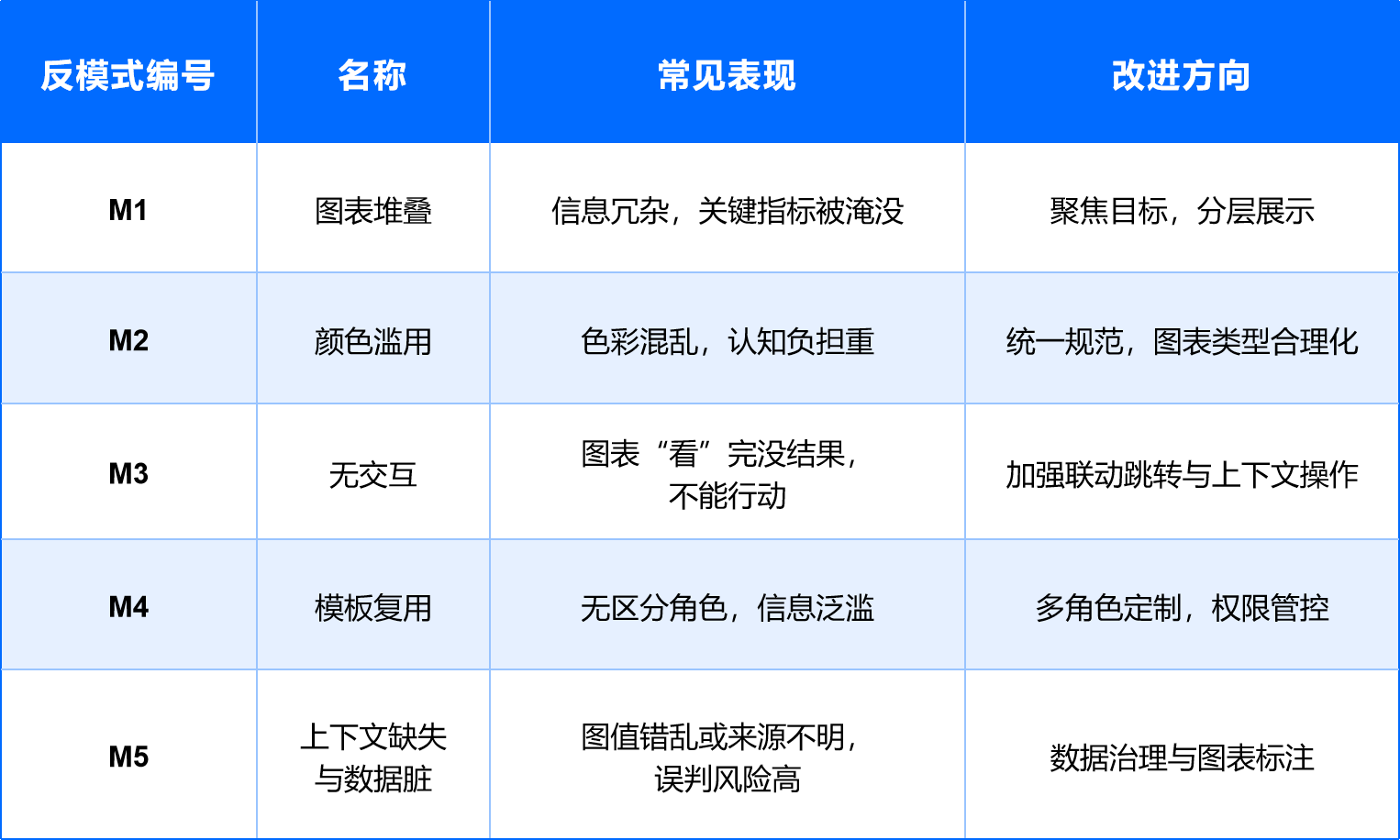 典型表現:圖表中指標值突變,用戶不知是否為系統故障、采集中斷或配置錯誤。表格總結:可視化反模式速查表