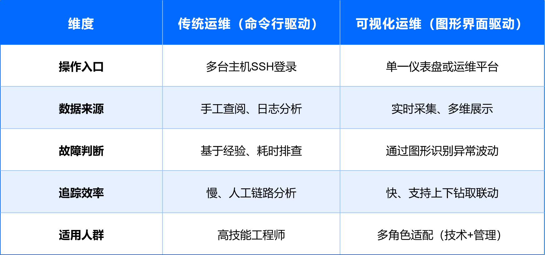 在傳統模式下,運維人員通過命令行工具(如 top、ps、netstat、iostat 等)進行系統巡檢和問題排查。但在多集群、多節點、跨數據中心的環境中,這種方式不僅耗時高、效率低,而且極易遺漏隱患。