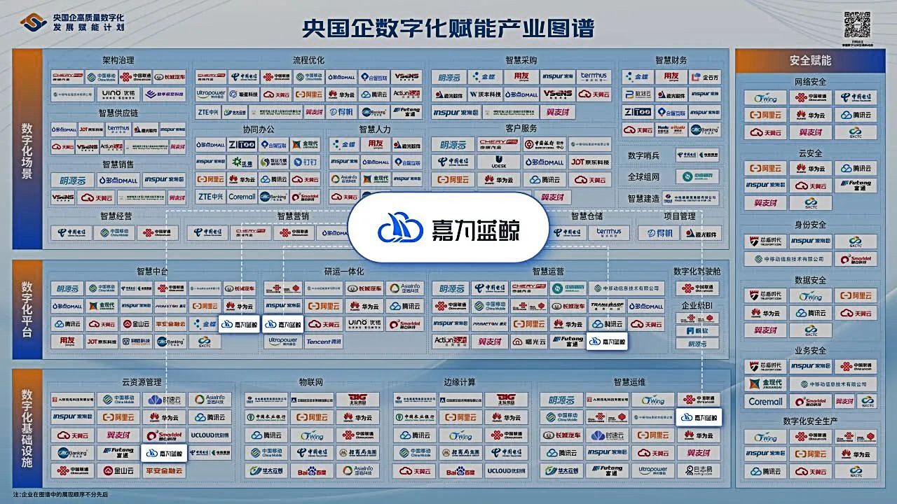 此外,嘉為藍鯨在2023年和2024年連續兩年入選信通院《央國企數智化發展賦能圖譜》,憑借卓越的技術實力和深厚的行業經驗,榮譽入選智慧中臺、研運一體化、智慧運維、云資源管理、智慧運營多個關鍵分類,再次證明了嘉為藍鯨在數字化領域的領先地位。