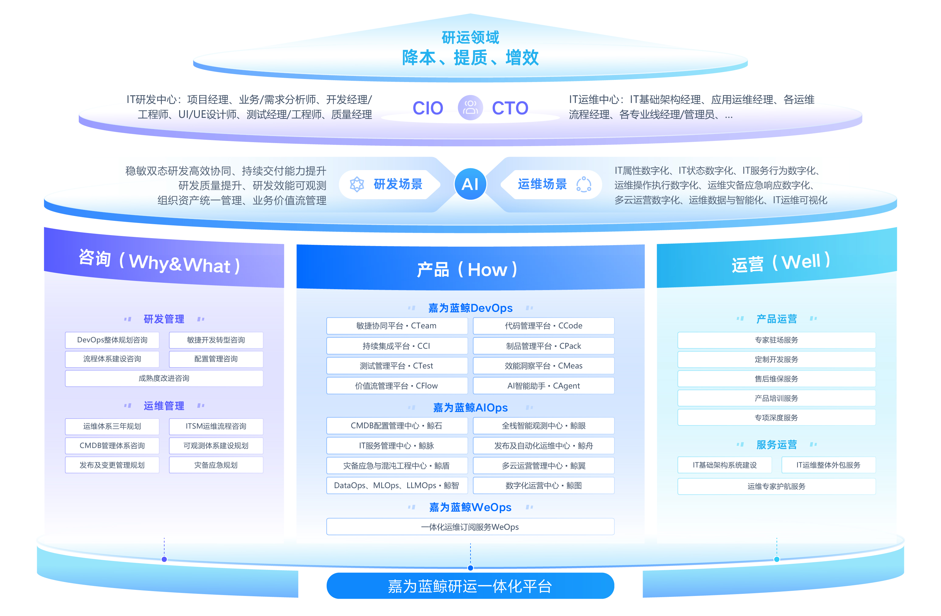 嘉為藍鯨,是業界知名的數字研運解決方案品牌,結合先進的藍鯨PaaS技術架構、融合嘉為科技20余年研運經驗打造的一體化平臺,包含:嘉為藍鯨DevOps一站式研發效能解決方案,嘉為藍鯨AIOps一體化、平臺化、智能化運維解決方案,嘉為藍鯨WeOps一體化智能運維訂閱服務。